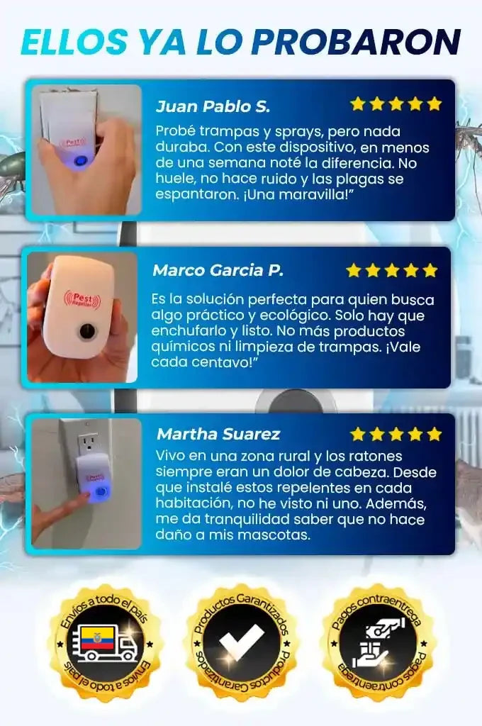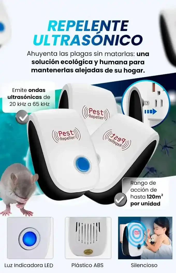 Emite ondas ultrasónicas de frecuencia variable que repelen plagas sin que desarrollen inmunidad.